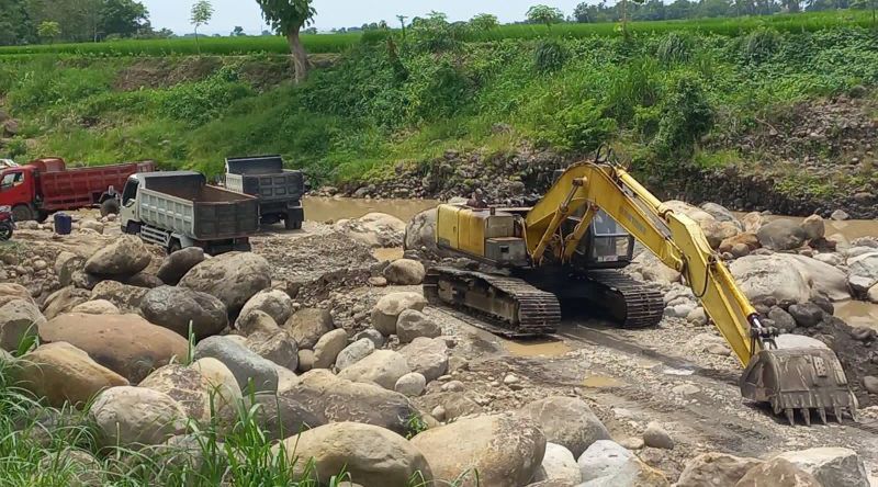 Berdasarkan pantauan wartawan di lokasi pada Selasa, 8 Februari 2022, beberapa alat berat seperti ekskavator beroperasi dan juga sejumlah dump-truk mengantri menunggu giliran mengisi material pasir dari sungai tersebut.