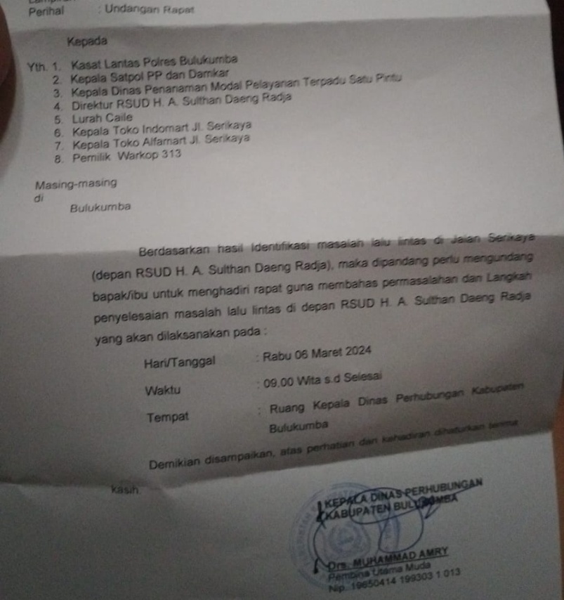 Dalam isi surat tersebut dijelaskan berdasarkan hasil indentifikasi lalulintas di jalan Srikaya (depan RSUD Andi Sultan Daeng Radja) maka dipadang perlu mengundang pemilik usaha untuk menghadiri rapat guna membahas langkah penyelesaian masalah lalulintas.