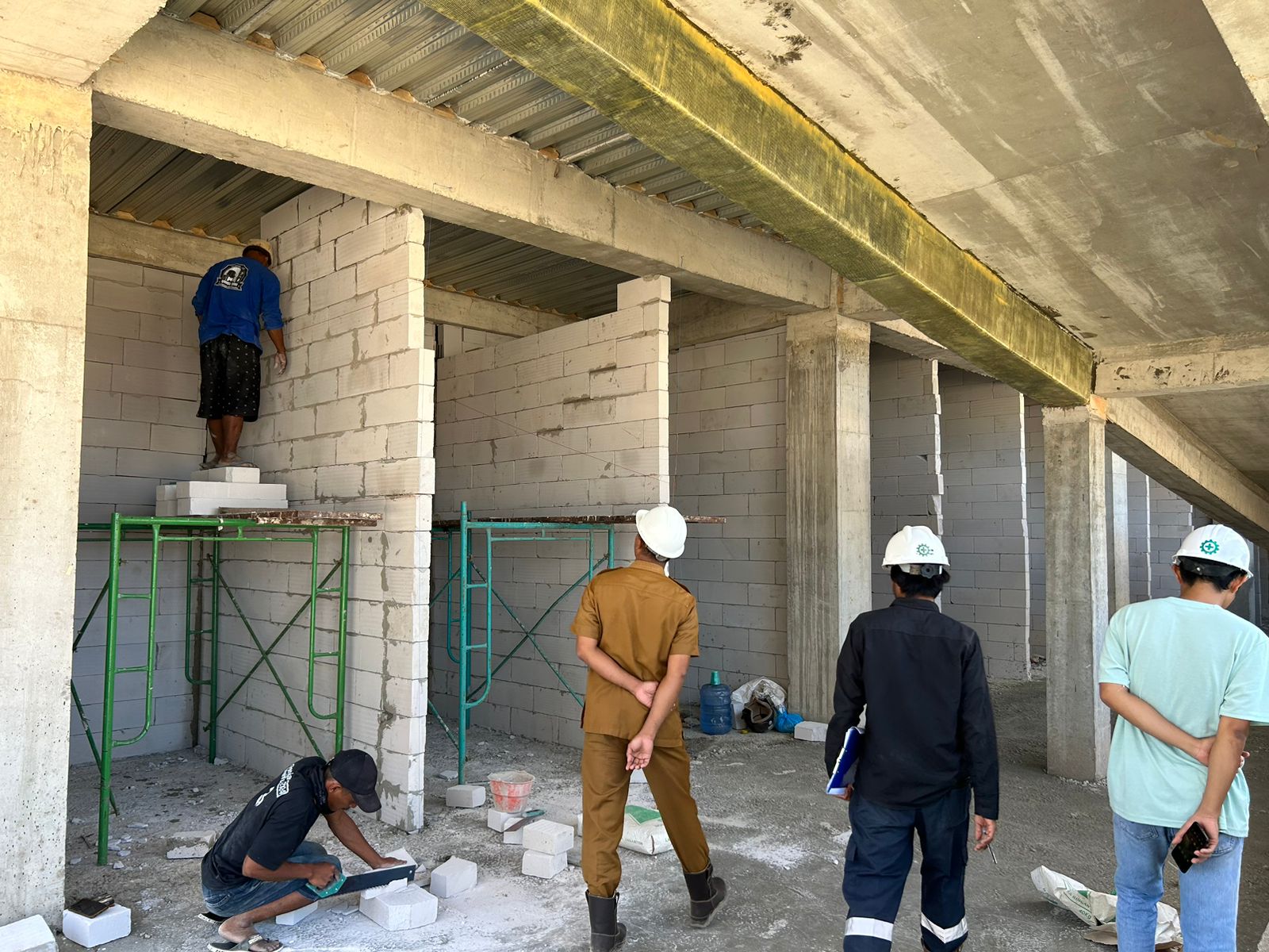 Dinding bata ringan telah terpasang hampir di seluruh bagian bangunan, dan kerangka atap baja juga telah selesai dipasang.