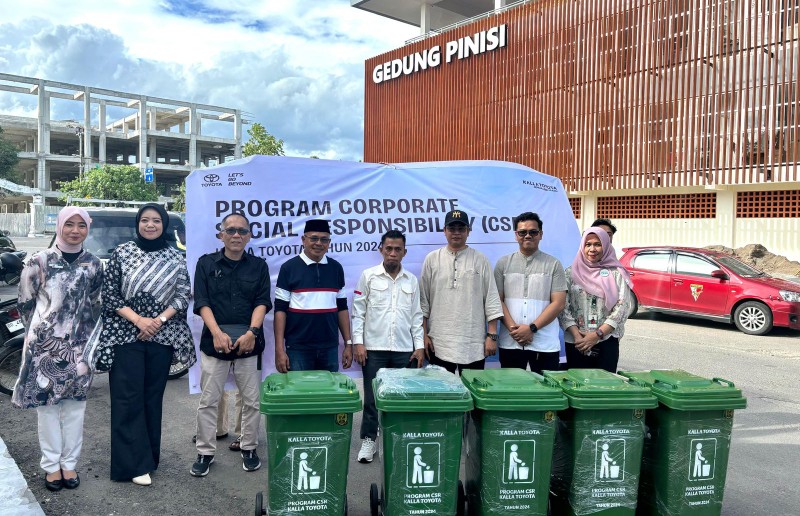 Sebanyak 33 kontainer sampah yang berasal dari program Corporate Responsibility Social Kalla Toyota diterima oleh Sekretaris Daerah Muh Ali Saleng didampingi Kepala Dinas Lingkungan Hidup dan Kehutanan, Andi Uke Indah Permatasari, di depan Gedung Pinisi, Jumat, 31 Januari 2025.