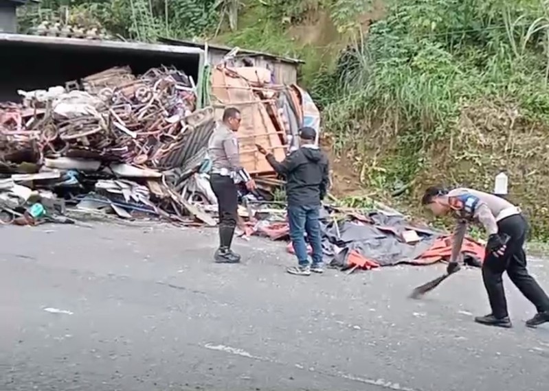 “Pas jalan penurunan mobil langsung terbalik dan muatan besi-besi tua tertumpah ke jalan,” Kata Aditya.