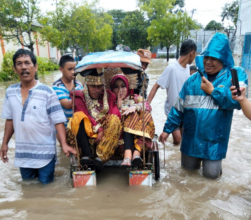 Pasangan pengantin kemudian menerobos banjir dengan becak serta pengawalan sejumlah kerabat pegantin dan pihak kepolisian dari satuan lalu lintas melalui bajir.