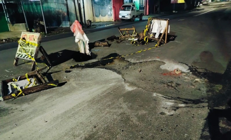Dari pantauan rubrik.co.id Kamis malam 3 Juli 2025 mengatakan kalau lubang besar hampir 2 meter dengan kedalaman 50 cm mengancam nyawa pengendara.