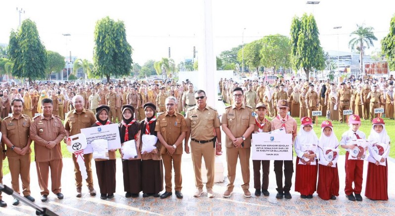 Pembagian seragam sekolah gratis ini diserahkan secara simbolis oleh Bupati Bulukumba Andi Muchtar Ali Yusuf di sela Apel Gabungan OPD di Kantor Bupati Bulukumba, Senin 14 Mei 2025.