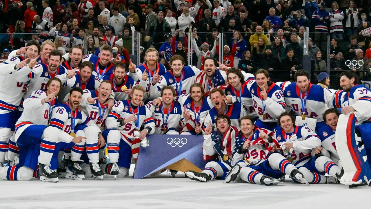 Pemain Amerika Serikat merayakan emas hoki es putra usai menundukkan Kanada di final Olimpiade Musim Dingin Milano Cortina 2026.